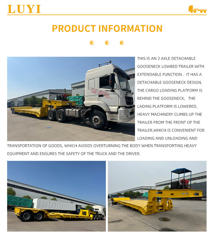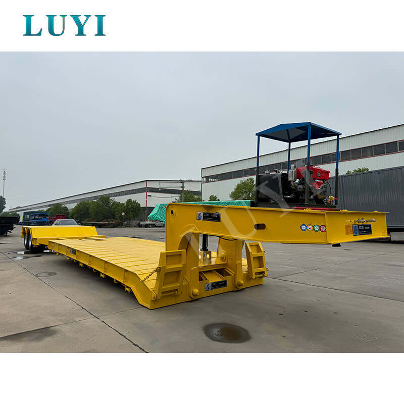 Originário de Shandong, China, o Luyi Detachable Gooseneck Lowboy Trailer é um semirreboque profissional dedicado ao transporte pesado. Construída em aço carbono de alta qualidade, sua viga principal adota aço Q345B/ST52-3 de alta resistência, garantindo uma estrutura sólida e durável. Medindo 12.000 mm × 2.500 mm × 1.650 mm, é adequado para vários cenários de trabalho.