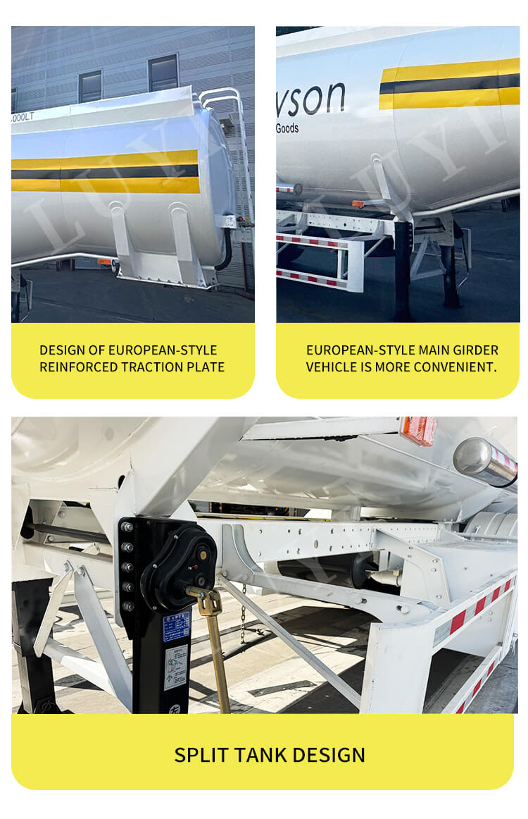 O semirreboque tanque de combustível diesel LUYI de 3 eixos e 3 tanques 42.000L, um novo equipamento profissional de transporte de petróleo, é produzido em Shandong, China. Seu corpo é feito de aço, com dimensões de 1065025003800mm. O projeto de 3 tanques permite o carregamento classificado de diesel, e a grande capacidade de 42.000 litros, combinada com uma carga útil máxima de 5.001 a 10.000 kg, atende às necessidades de transporte de petróleo de pequenos e médios lotes.