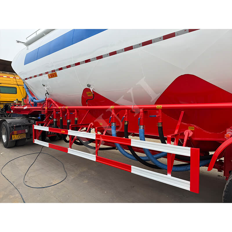 O veículo é equipado com 3 eixos (disponíveis nas marcas ZY/Fuhua/BPW como opções), combinados com sistema de suspensão mecânica e molas de lâmina com especificação 90×13×10 mm. É compatível com vários pneus, incluindo 12R22.5/12.00R20/11R22.5, garantindo uma condução estável e adaptabilidade a diferentes condições de estrada. Também é equipado com pernas de suporte padrão JOST de 28 toneladas e pinos mestre JOST de 2 polegadas (50 mm) ou 3,5 polegadas (90 mm), garantindo segurança durante o estacionamento e a conexão. As cores personalizáveis atendem plenamente às diversas necessidades de transporte de cimento a granel.