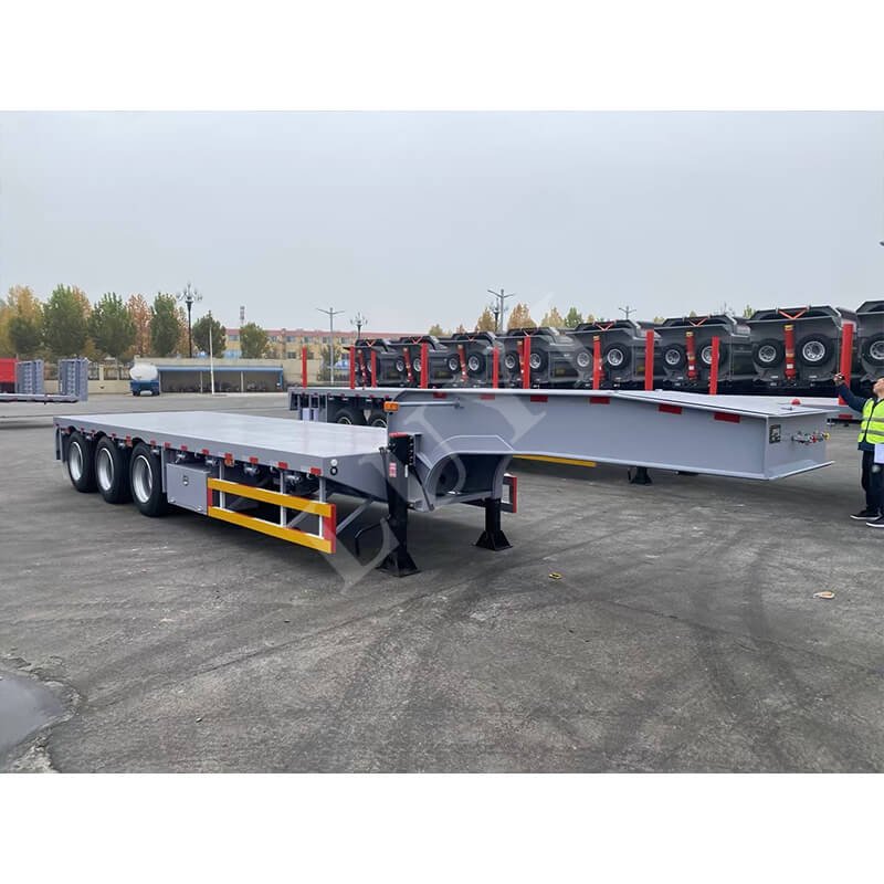O trailer oferece dimensões de 11500/12500/13000×3000×1750mm, que também são personalizáveis. É equipado com molas de lâmina de 90 mm (largura) × 13/16 mm (espessura) × 10 camadas, e os eixos podem ser selecionados da marca FUWA de 13/16 toneladas, garantindo uma operação estável e confiável. O sistema de frenagem utiliza válvulas relé para resposta sensível; o pino mestre tem a especificação JOST de 2 polegadas (50 mm) ou 3,5 polegadas (90 mm), e o trem de pouso adota o tipo JOST de duas velocidades de 28 toneladas para fácil operação. As cores podem ser personalizadas para se adequarem a diversos cenários de transporte.