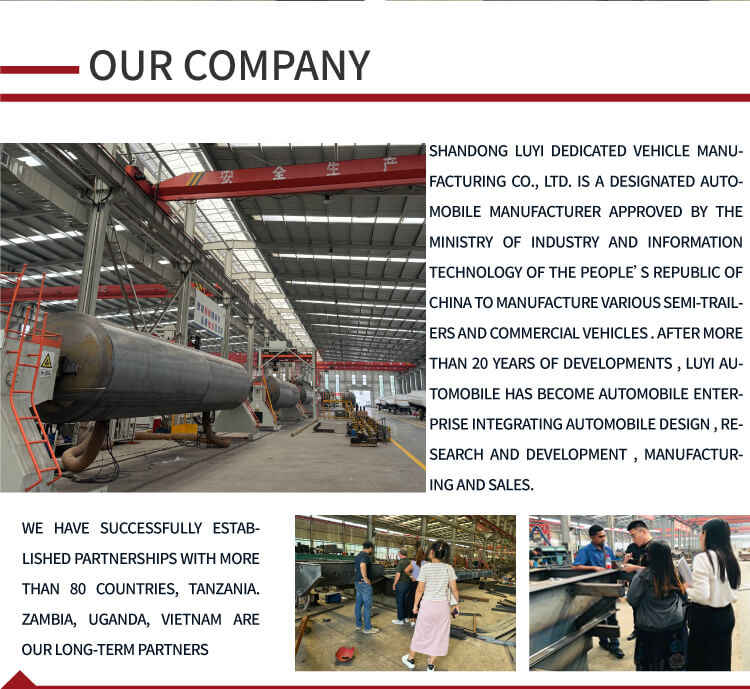 -Nossa fábrica:Veículo Co. de Shandong Luyi, Ltd. é um dos fabricantes qualificados de vários reboques, como semirreboque rebaixado, reboque plano, reboque de carga, semirreboque contêiner esqueleto, reboque plano de 50 pés, etc. Com máquinas de alto padrão e equipamentos automáticos, poderosa equipe de P&D e equipe de vendas de elite, construímos um longo relacionamento comercial com muitas empresas mundialmente famosas, como SINOTRUK, SHACMAN, etc.