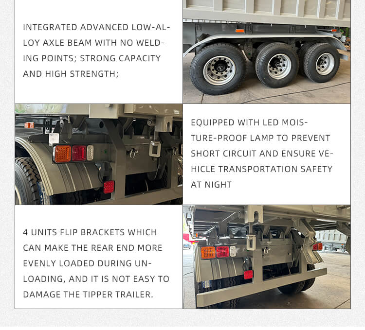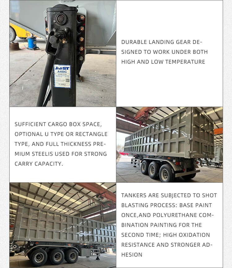 Ele oferece configurações flexíveis para atender a diversas necessidades: as opções de eixo incluem eixos 2/3/4 das marcas confiáveis BPW e FUWA e opções de suspensão mecânica ou a ar para uma direção estável. Equipado com pneus 12R22.5, um trem de pouso padrão de 28 toneladas e pinos rei JOST de 2"(50mm)/3,5"(90mm), garante forte adaptabilidade. O processo de pintura de poliuretano aumenta a durabilidade, a cor é personalizável e vem com garantia de seis anos, tornando-o confiável para transporte de areia e cascalho de longo prazo.