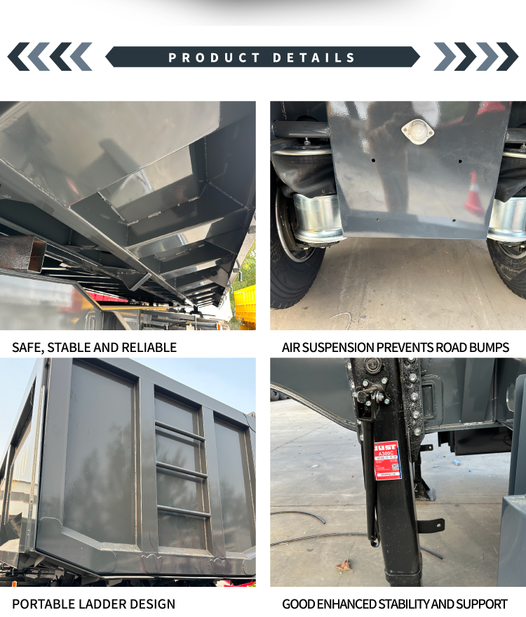 Contando com um sistema de elevação hidráulico, a caixa de carga pode atingir uma inclinação traseira de 45 a 60° para descarga. O design de abertura traseira torna a operação simples e eficiente com um curto tempo de descarga. Equipado com freios a ar, suspensão mecânica/mola e pino de tração padrão, é compatível com a maioria dos tratores pesados e tem baixos custos de manutenção. O revestimento preto é resistente à sujeira e fácil de manter. Seja para transferência de materiais em curta distância, como carvão, minério e cascalho, ou para transporte rodoviário de longa distância, é um parceiro de transporte confiável e eficiente.
