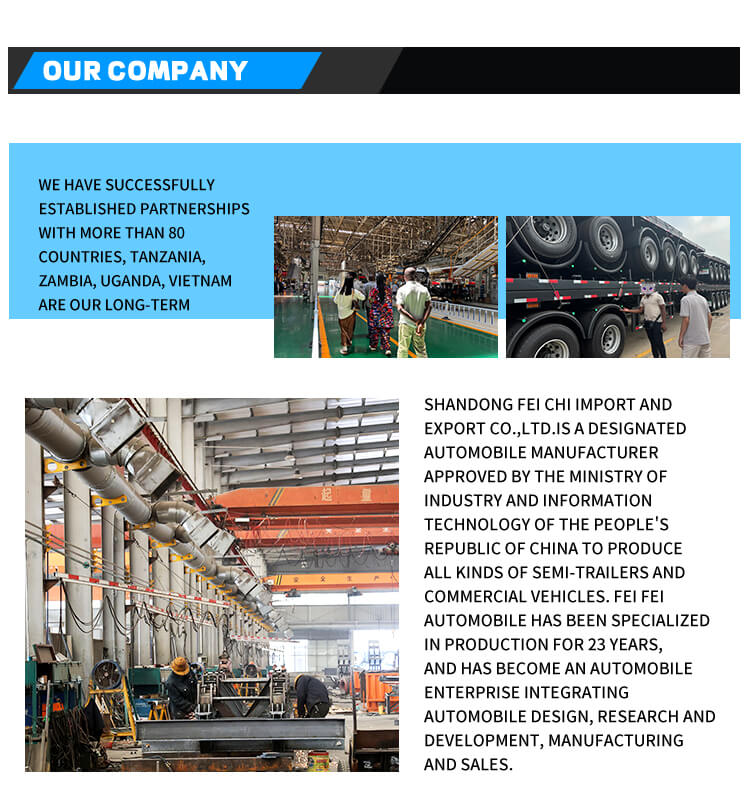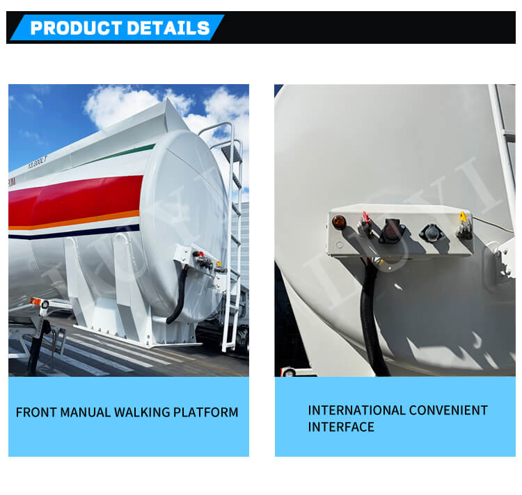 O trailer apresenta configurações sólidas e confiáveis. É equipado com eixos de 13/16 toneladas de marcas como Fuwa, BPW ou BERKLEY e oferece suspensão mecânica ou pneumática opcional. É compatível com várias especificações de pneus, incluindo 11.00r20, 12r22.5 e 315/385, garantindo uma condução estável e adaptabilidade a diferentes condições de estrada. Ele vem com trem de pouso padrão de 28 toneladas e pinos mestre 50#/90# para operação conveniente e segura. O produto suporta cores de carroceria personalizadas, combinando praticidade e personalização para fornecer uma solução profissional estável e eficiente para transporte de petróleo.
