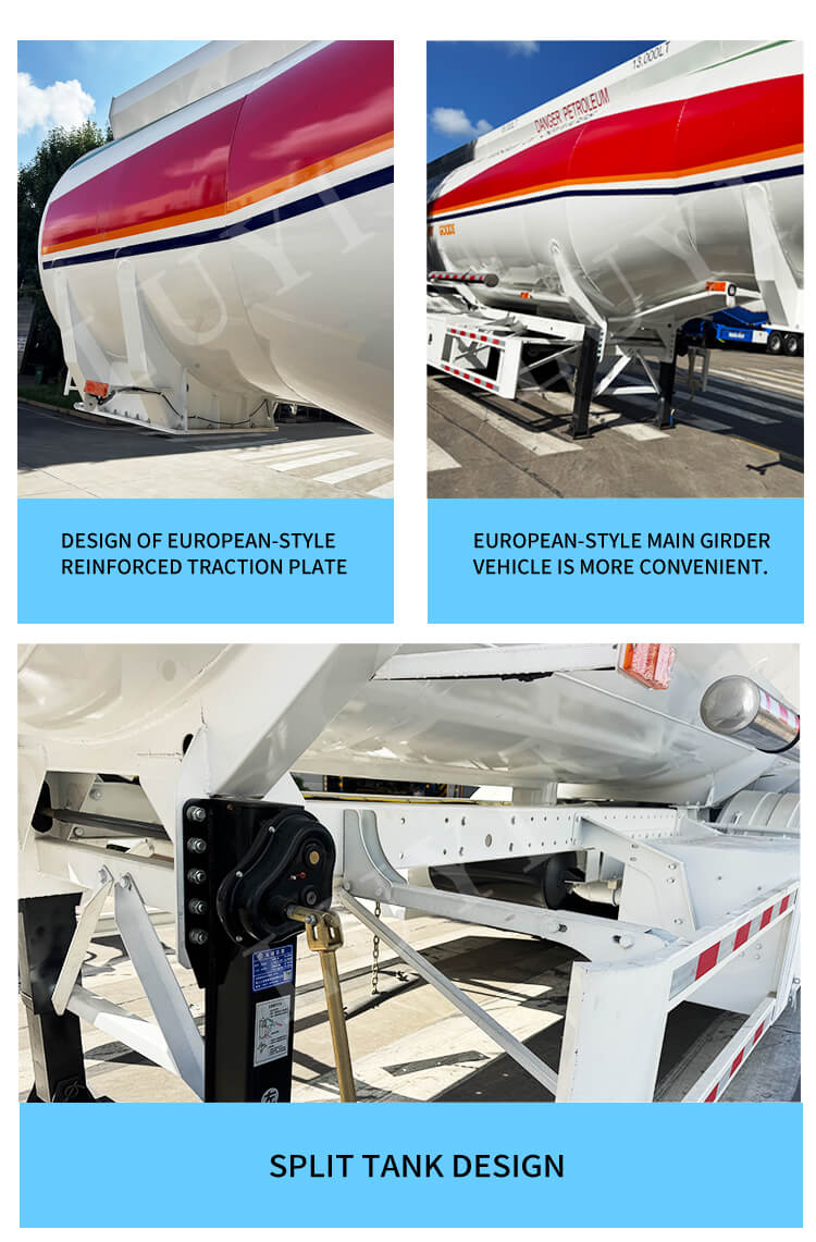 O semirreboque tanque de combustível LUYI de 3 tanques e 43.000L, produzido em Shandong, China, é um equipamento profissional de transporte de petróleo totalmente novo. Seu corpo é feito de aço, com dimensões de 1085025003800mm. O projeto de 3 tanques permite o carregamento classificado de produtos petrolíferos, e a grande capacidade de 43.000 litros, combinada com uma carga útil máxima de 20.001-25.000 kg, atende à demanda por transporte eficiente de petróleo.