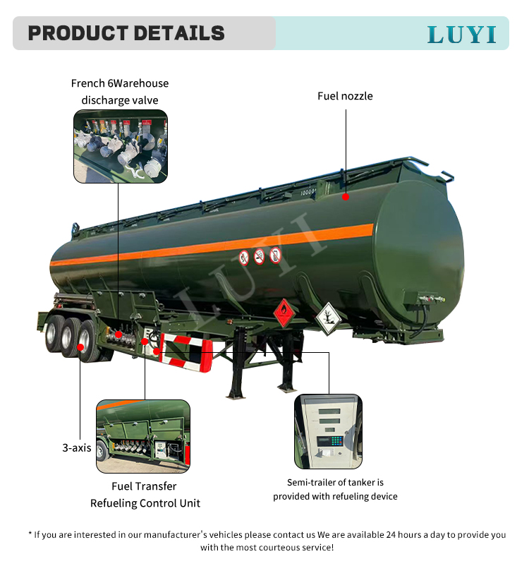 O semirreboque caminhão-tanque a diesel LUYI 38.000L, originário de Shandong, China, é um reboque dedicado confiável para transporte de asfalto. Com dimensões totais de 12.500 mm * 2.500 mm * 3.980 mm, é feito de aço carbono para maior robustez e durabilidade, adequado para condições complexas de transporte.