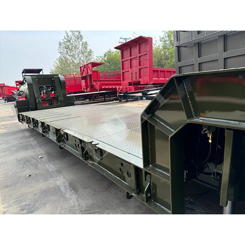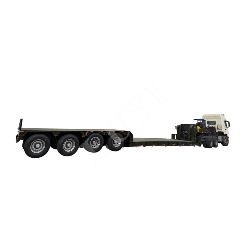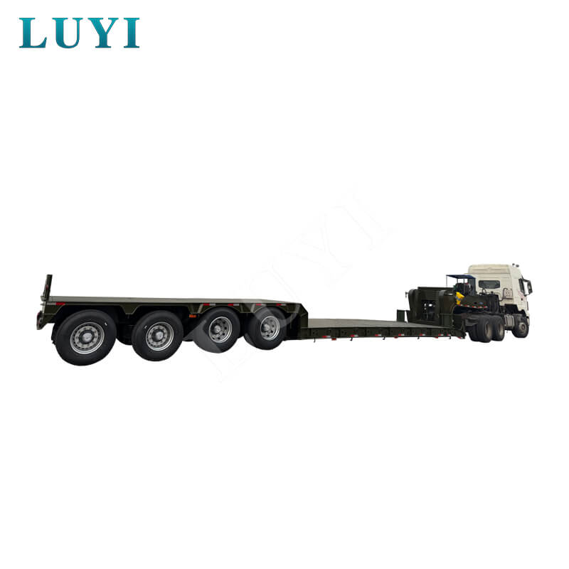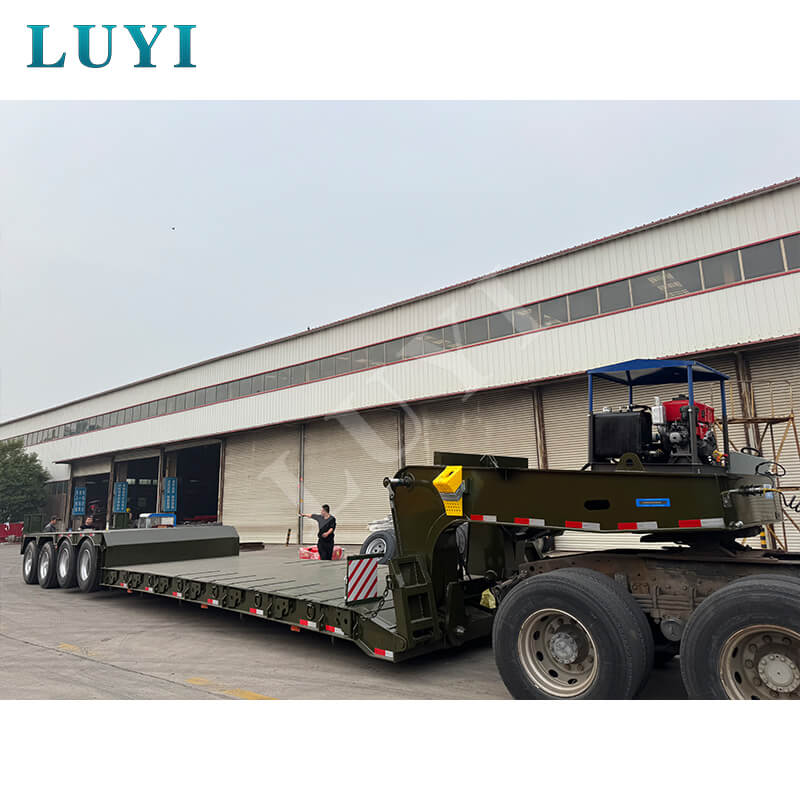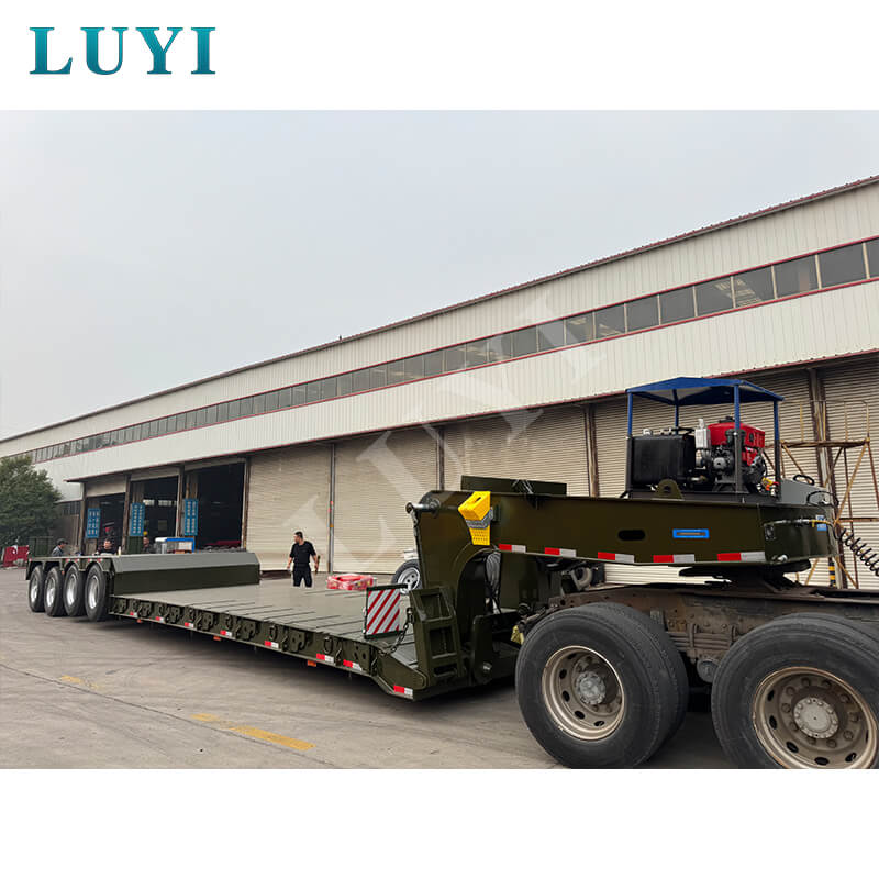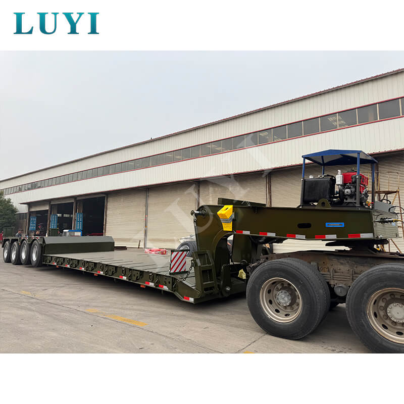 O semirreboque Luyi de 4 eixos destacável pescoço de ganso de 150 toneladas, originário da província de Shandong, China, é um semirreboque de alta qualidade especialmente projetado para transporte de equipamentos pesados. Construído em aço de alta qualidade, possui excelente capacidade de carga, com carga útil máxima efetiva de 100 toneladas, permitindo o transporte estável de diversos tipos de equipamentos pesados.