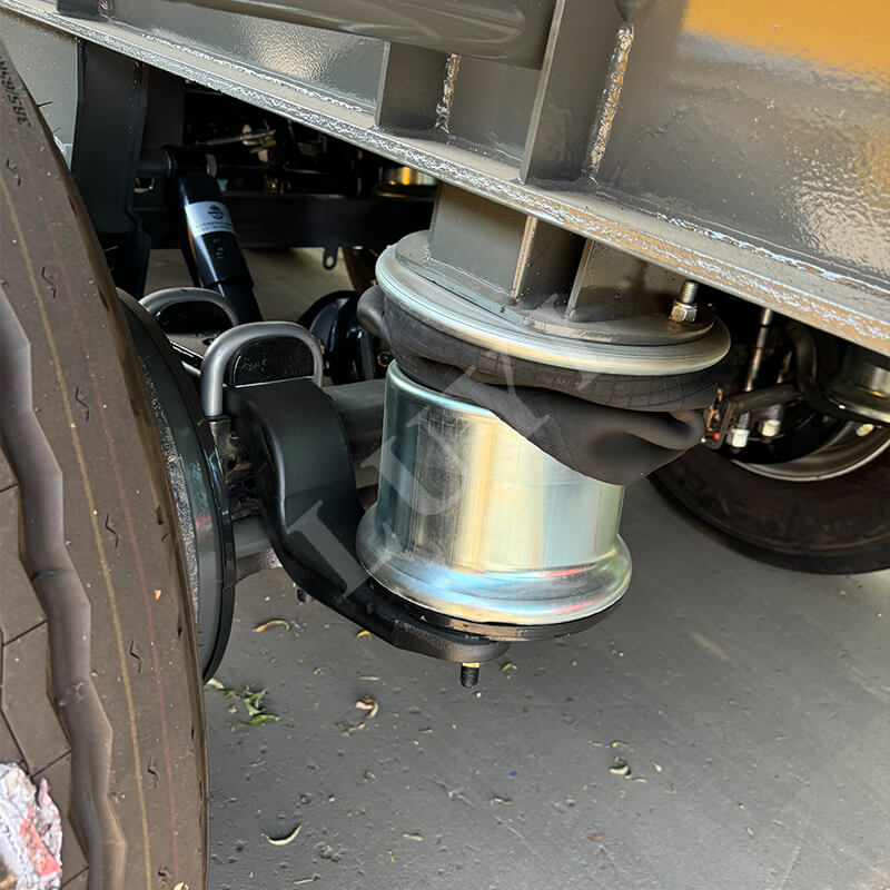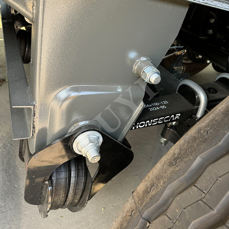 O veículo está equipado com pneus sem câmara 12R22.5, que passaram por diversas certificações internacionais, incluindo ECE, GCC, ISO e DOT. Esses pneus são resistentes ao desgaste, duráveis e reduzem o risco de estouro dos pneus. Oferece configurações flexíveis de eixos 2/3/4, emparelhados com pinos mestre JOST de 2 polegadas (50 mm) ou 3,5 polegadas (90 mm), adaptando-se a diferentes tratores e atendendo a vários cenários de transporte. O sistema de suspensão mecânica garante uma condução estável e o design de capotamento do airbag completo melhora significativamente a eficiência de descarga e reduz os custos de mão-de-obra.