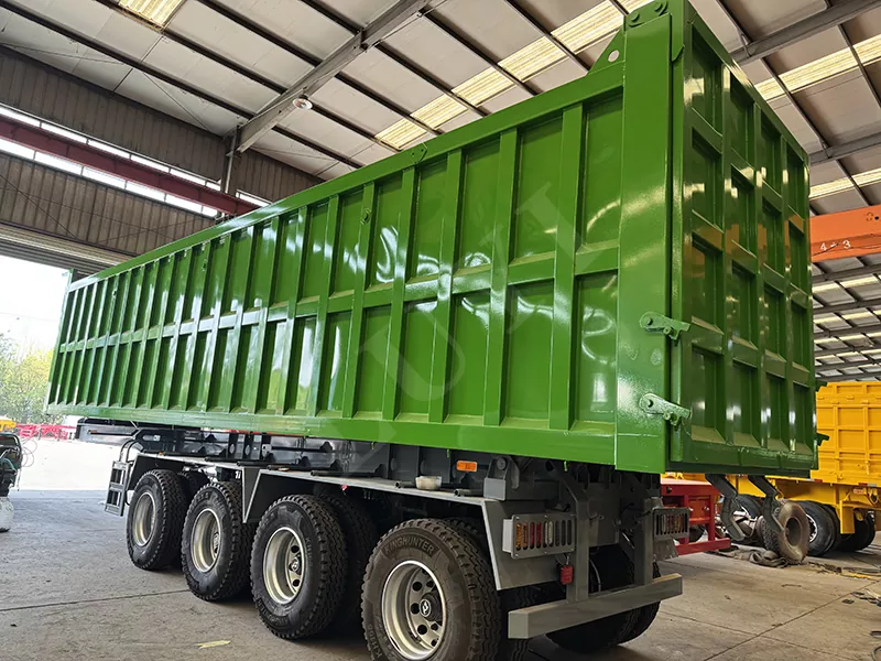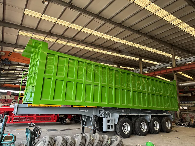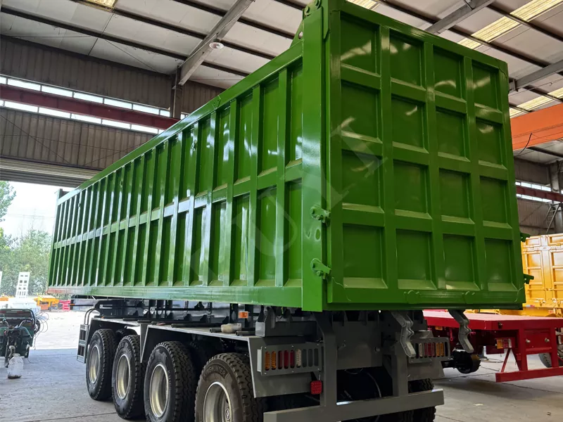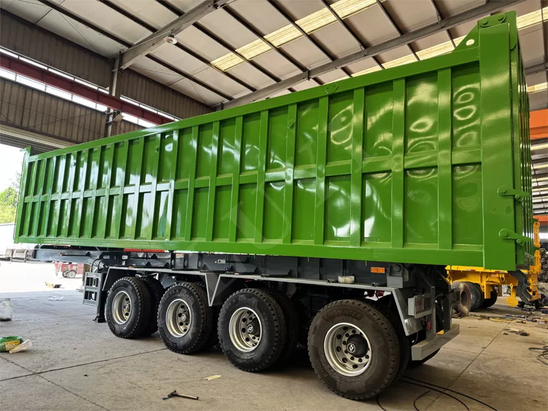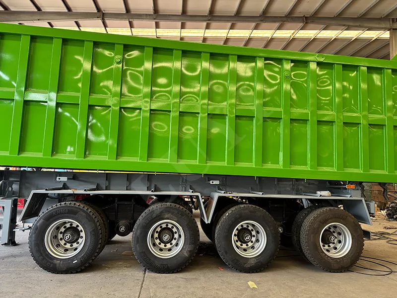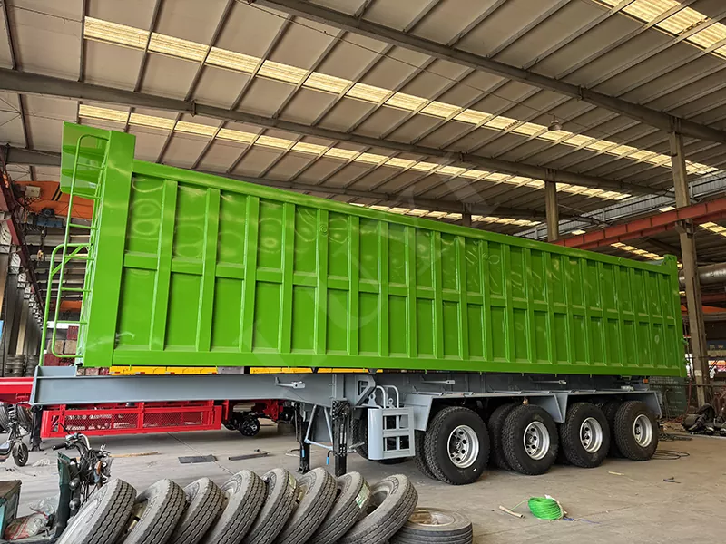 O semirreboque basculante traseiro de 4 eixos tem 13 metros de comprimento, 2,5 metros de largura, capacidade de carga de 80 toneladas e 40 metros cúbicos.