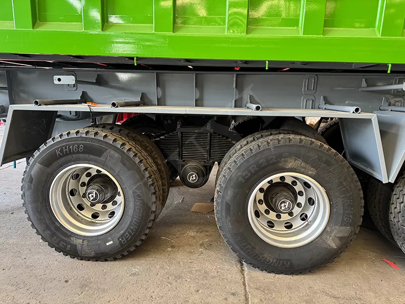 Marca 4X16T Guangdong Fuhua ou marca BPW. Fio de aço opcional ou pneus a vácuo, pneus simples e pneus duplos podem ser projetados. Suspensão pneumática de quatro eixos ou suspensão mecânica, mola de lâmina para serviço pesado, WABCO ABS. Yost estabilizadores e pinos de tração, válvulas de relé WABCO, circuitos elétricos de 24 V, faróis de LED, design de pára-choque anticolisão, equipado com caixas de ferramentas de grande porte, todo o veículo adota processo especial de pulverização de pó, fábrica de pulverização de cera, para garantir a segurança do transporte marítimo.
