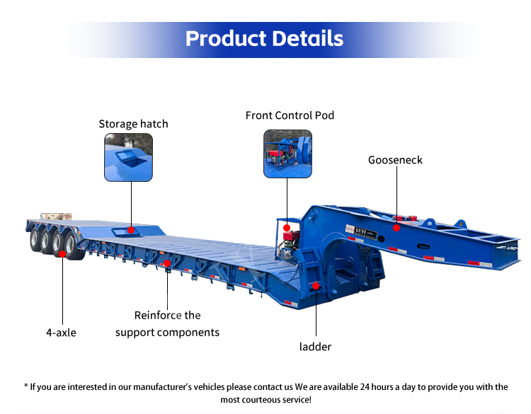 O design pescoço de ganso permite fácil carga e descarga, permitindo que máquinas pesadas sejam transportadas para o reboque sem equipamento auxiliar adicional. Ideal para o transporte de máquinas de construção, equipamentos de mineração e grandes produtos siderúrgicos, este semirreboque equilibra eficiência e segurança, tornando-o uma escolha confiável para operações de logística e engenharia.