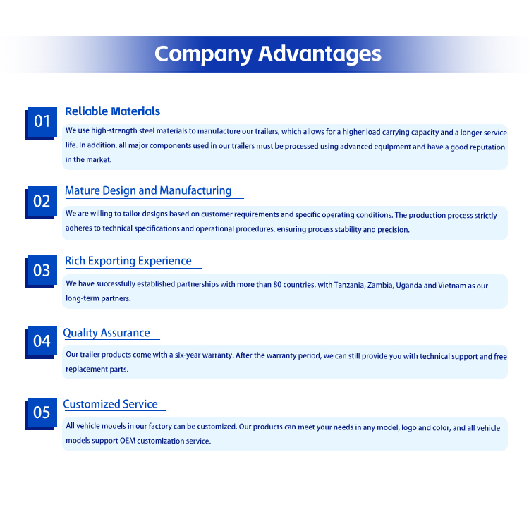 Com dimensões totais de 1300030001700mm, possui uma grande plataforma de carga de 1300030001250mm. A placa diamantada de 3mm garante resistência antiderrapante e ao desgaste, garantindo um transporte estável de carga. Seus componentes principais incluem três conjuntos de eixos FUWA de 13 toneladas para excelente desempenho de frenagem e durabilidade, combinados com pneus 11.00R20 para se adaptar a condições de estrada complexas. O pino de tração de especificação dupla de 50 mm/90 mm e o trem de pouso padrão de 28 toneladas atendem a diferentes necessidades de tração e garantem estabilidade de estacionamento.