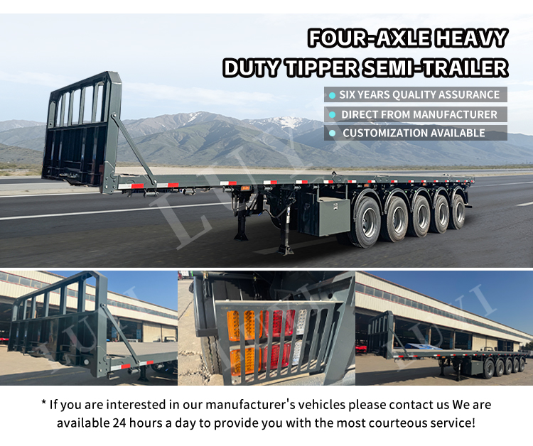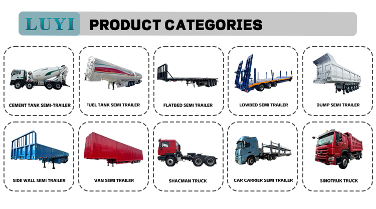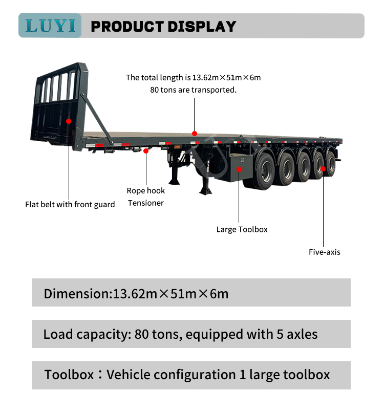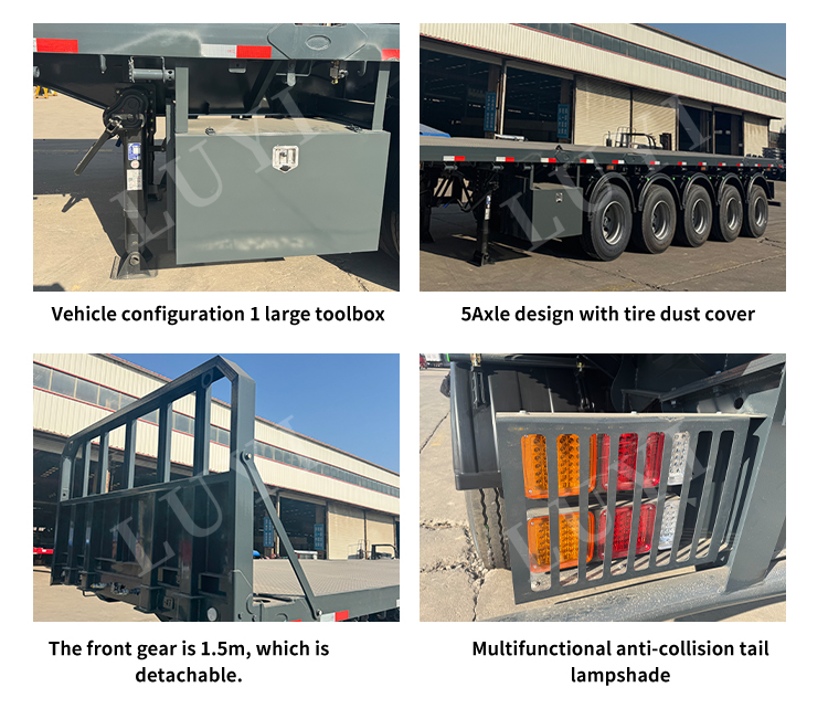 A cor do corpo suporta personalização personalizada, ajustável de acordo com as necessidades do cliente para atender às necessidades de uso e exibição de diferentes cenários. Com as principais vantagens de alta capacidade de carga, forte adaptabilidade e desempenho estável, o semirreboque plano de 5 eixos LUYI se destaca como o equipamento preferido para operações eficientes na indústria de transporte de materiais de construção, ajudando os usuários a reduzir custos, aumentar a eficiência e se destacar na corrida logística.