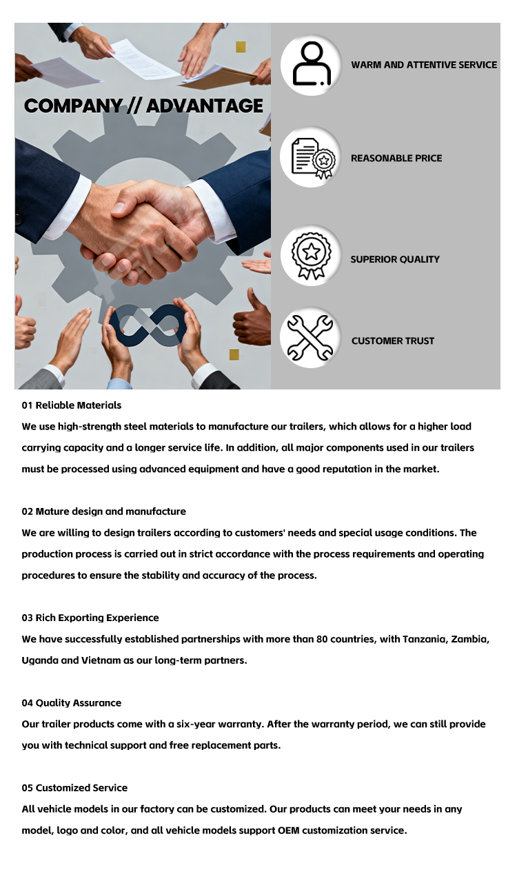 O trailer vem totalmente equipado com configurações de primeira linha: pneus 12R22.5 garantem aderência estável e durabilidade, adaptando-se a condições de estrada complexas; trem de pouso padrão de 28 toneladas fornece suporte robusto para operações seguras de carga e descarga; Os pinos principais JOST opcionais de 2 polegadas (50 mm) ou 3,5 polegadas (90 mm) oferecem conexão confiável e compatibilidade com tratores convencionais. O sistema de suspensão combina molas mecânicas com suspensão pneumática, proporcionando absorção de choque excepcional para minimizar danos aos materiais de construção durante o transporte e garantir a integridade da carga.