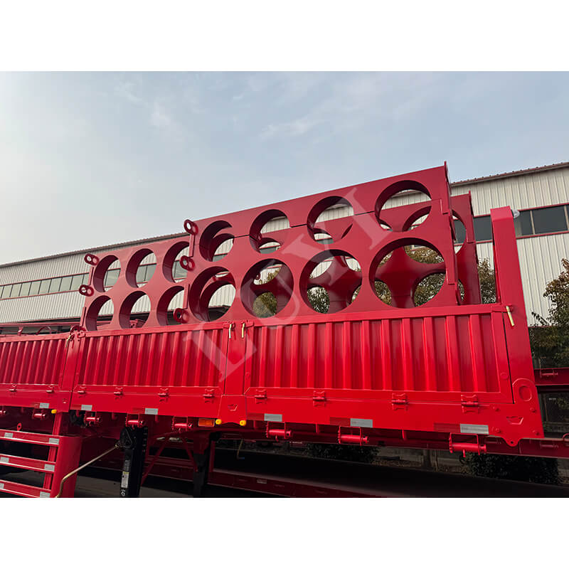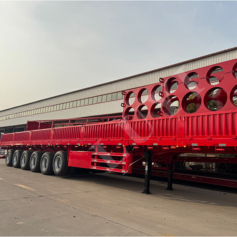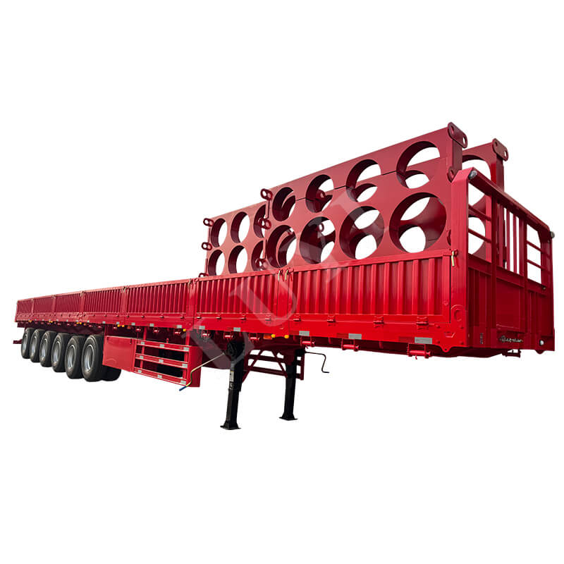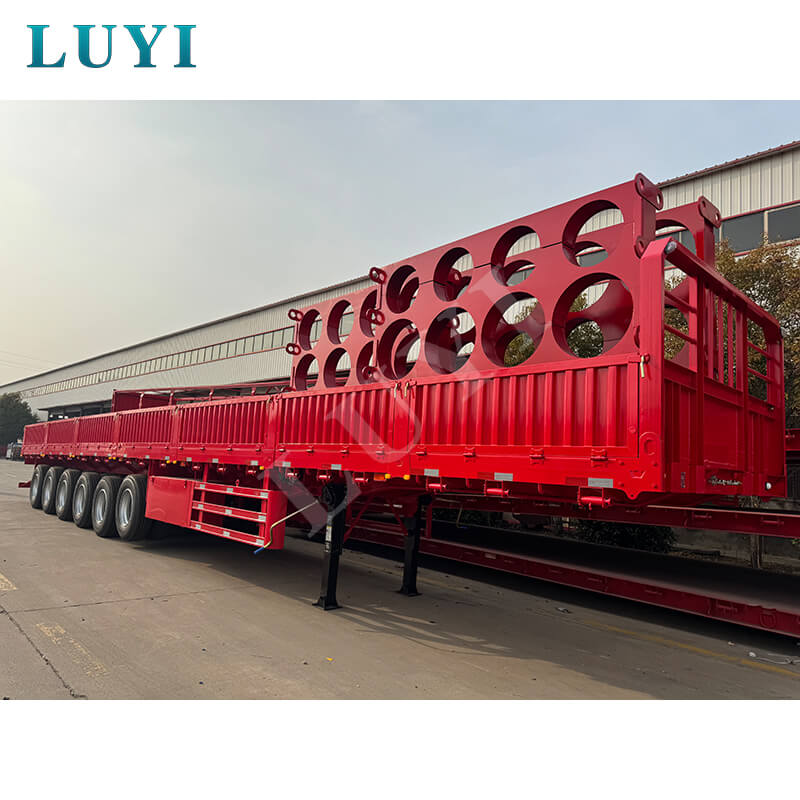 Semirreboque de parede lateral LUYI de 6 eixos, 15,5 m, 80-100 toneladas e 40 pés, também chamado de semirreboque tipo estaca/plataforma, é originário de Shandong, China. É um semirreboque de alta qualidade projetado para o transporte de contêineres e cargas a granel. Feito inteiramente de aço, mede 15500x2500x1600mm e tem uma carga útil máxima efetiva de 60-100 toneladas, ostentando forte capacidade de carga para atender facilmente às necessidades de transporte de carga pesada.