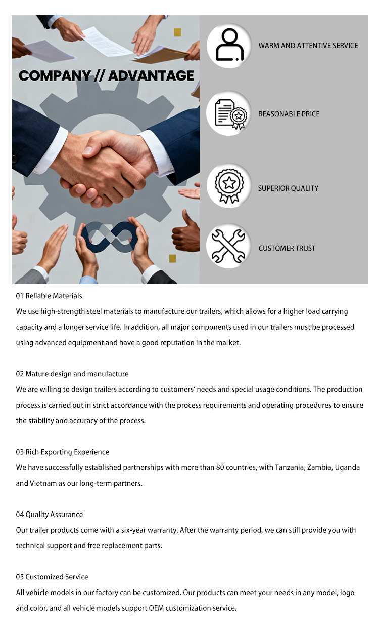 Envie-nos a sua consulta para obter um orçamento personalizado com base nas suas necessidades reais de transporte. Informe-nos o tipo de reboque, carga ou carga útil, condições da estrada, destino e quantidade, e nossa equipe responderá com uma recomendação adequada o mais rápido possível.
