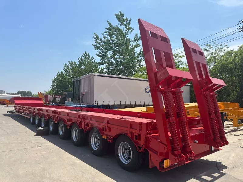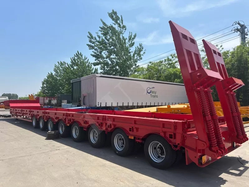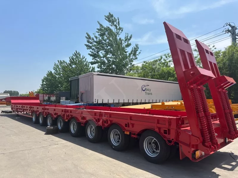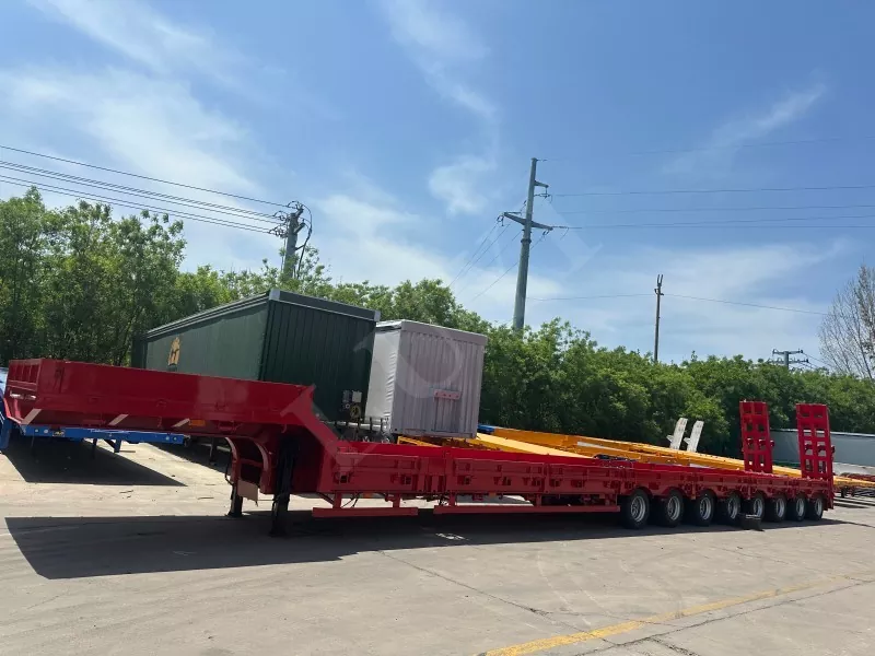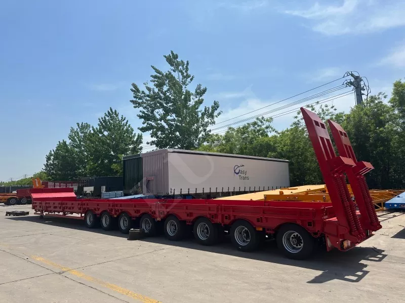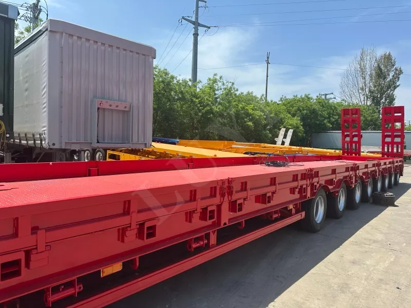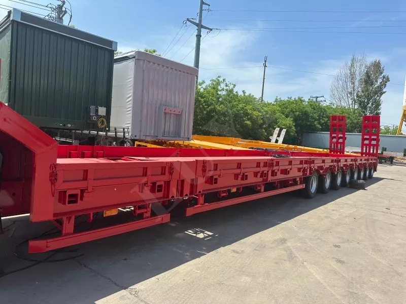 Trailer especial para 5 países da Ásia Central 17m 8m Transporte 80-100 toneladas. Nosso semi-reboque retrátil de 8 eixo pode ser ampliado à esquerda e à direita, com uma escada mecânica. Todo o veículo é feito de modelo T700 de aço resistente a desgaste de alta resistência. Seu eixo pode ser selecionado para levantar e girar, e possui um elevador e uma válvula inferior.