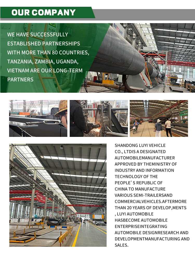 O semirreboque tanque de combustível LUYI de 3 eixos e 60 toneladas, originário da base de fabricação de alta qualidade em Shandong, China, é um equipamento de transporte confiável e eficiente, especialmente projetado para o transporte de petróleo. Todo o veículo é feito de aço de alta resistência, apresentando robustez e durabilidade. Com dimensões precisas de 12500x2500x3600MM, garante flexibilidade de transporte e eficiência de carregamento.