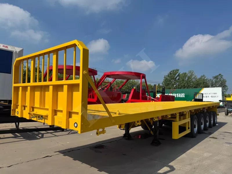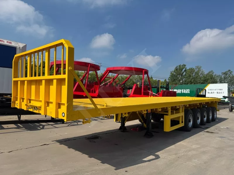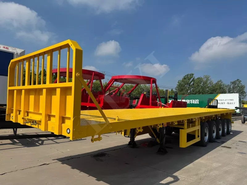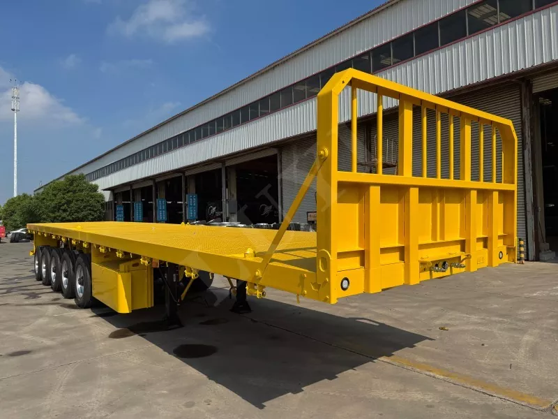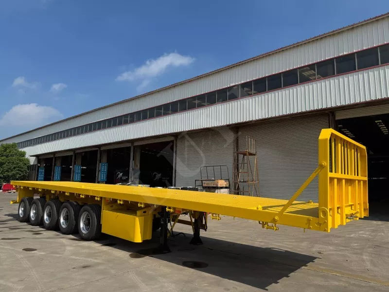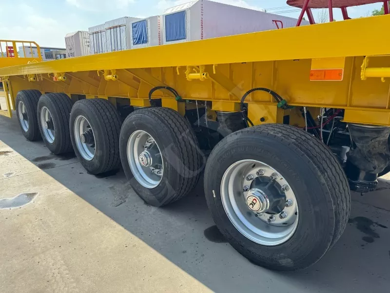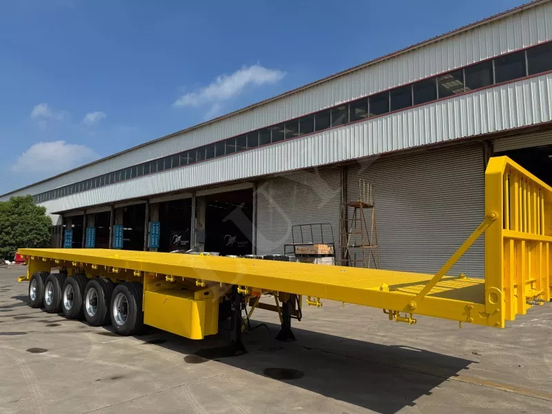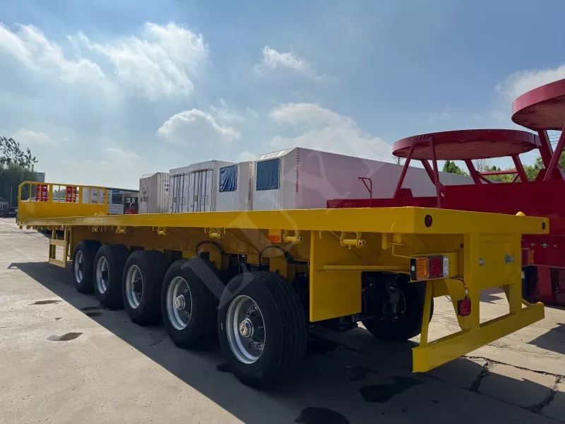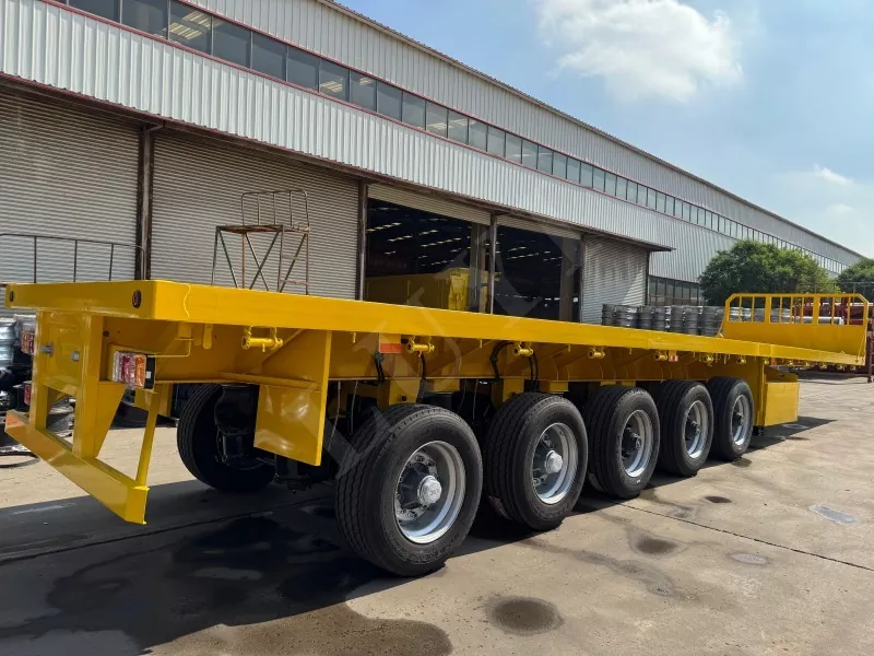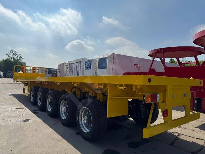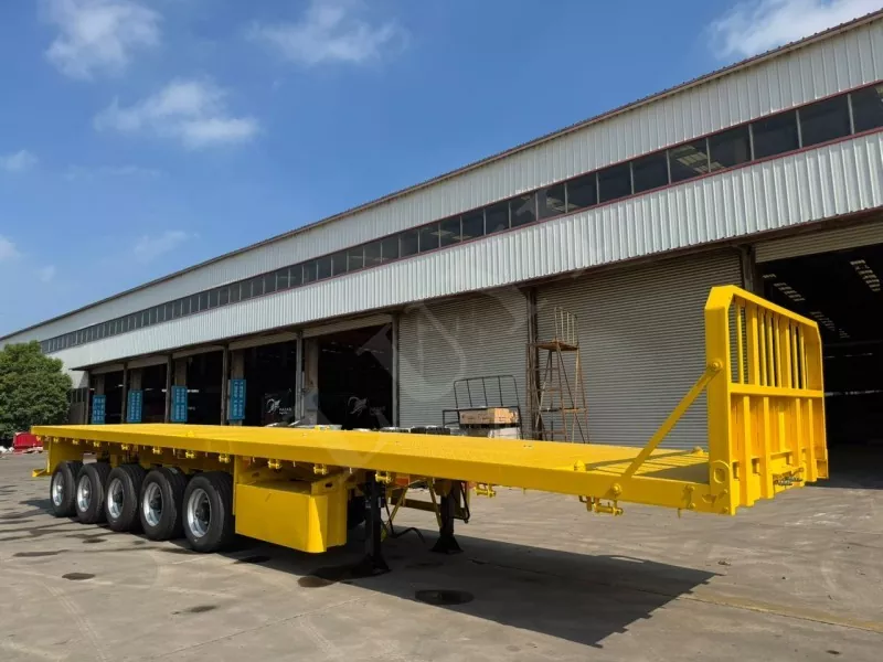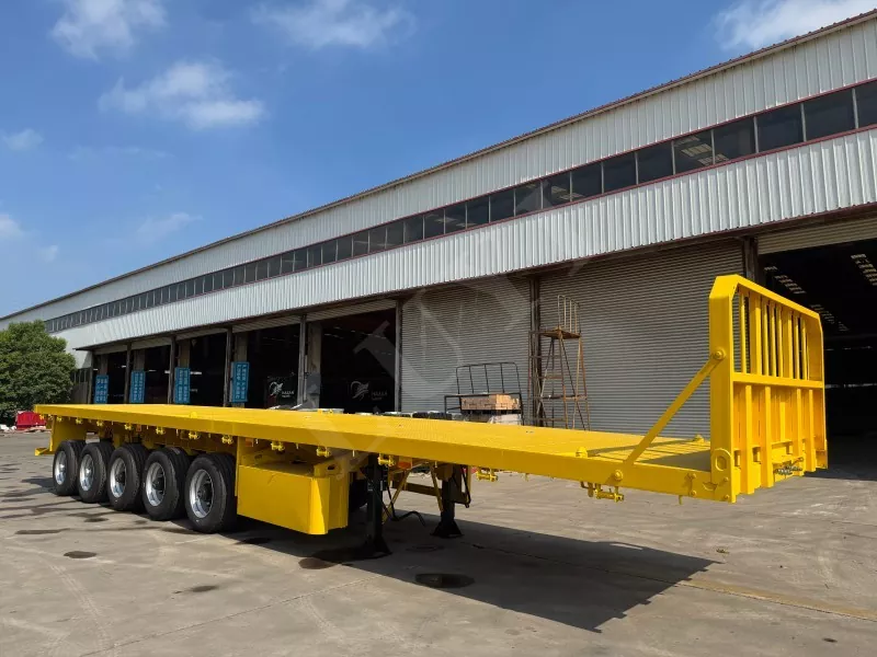 Nosso semirreboque plataforma conteinerizado tem 14,5 metros de comprimento e 2,5 metros de largura, com semirreboque plataforma de 5 eixos, função de direção de acompanhamento CTC nos 2 eixos traseiros, capaz de transportar 100 toneladas e equipado com 12 travas de contêiner.