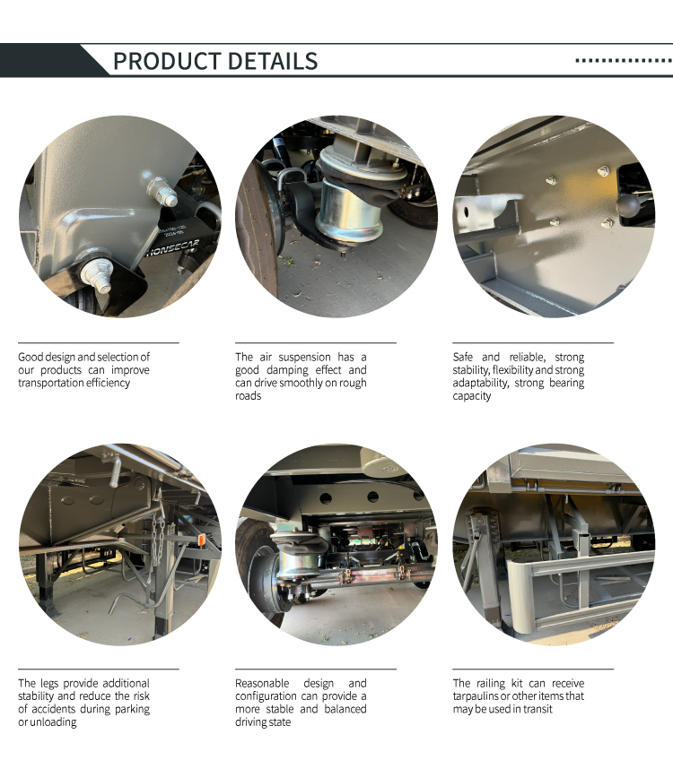 O semirreboque basculante lateral de 4 eixos classe LUYI de 60 toneladas é personalizado para transporte pesado de carga a granel em cenários como minas e projetos de infraestrutura. Adota uma estrutura de descarga hidráulica basculante lateral, permitindo descarga rápida em espaços estreitos e esvaziamento completo do compartimento em minutos, melhorando significativamente a eficiência do giro de carga. Os principais componentes de suporte de carga são feitos de aço durável de alta resistência, combinados com um design de 4 eixos e airbags com suspensão a ar. Isto não só distribui a pressão de cargas pesadas de 60 toneladas e atende aos requisitos regulamentares, mas também ajusta a dureza de absorção de choque de acordo com a carga, reduzindo os solavancos da carga e o impacto na estrada. Todo o veículo equilibra descarga eficiente, durabilidade de carga pesada e estabilidade de direção, tornando-o uma escolha confiável para transporte pesado de carga a granel.