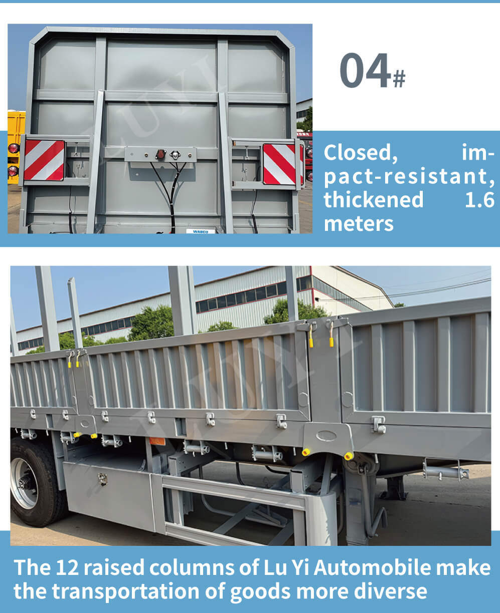 O semirreboque de parede lateral de 3 eixos com colunas da LUYI, marca sediada em Shandong, China, é a escolha ideal para transporte de carga a granel e contêineres. Construído com aço de alta qualidade, apresenta dimensões precisas de 12500x2500x1600mm e uma capacidade de carga máxima de 60 toneladas, cuja poderosa capacidade de carga pode facilmente atender a diversas necessidades de transporte pesado.
