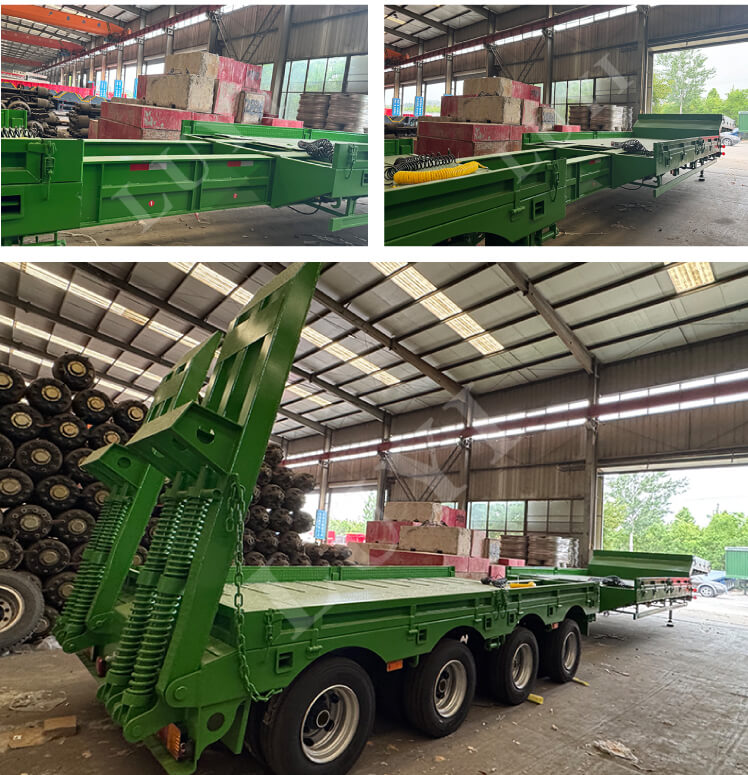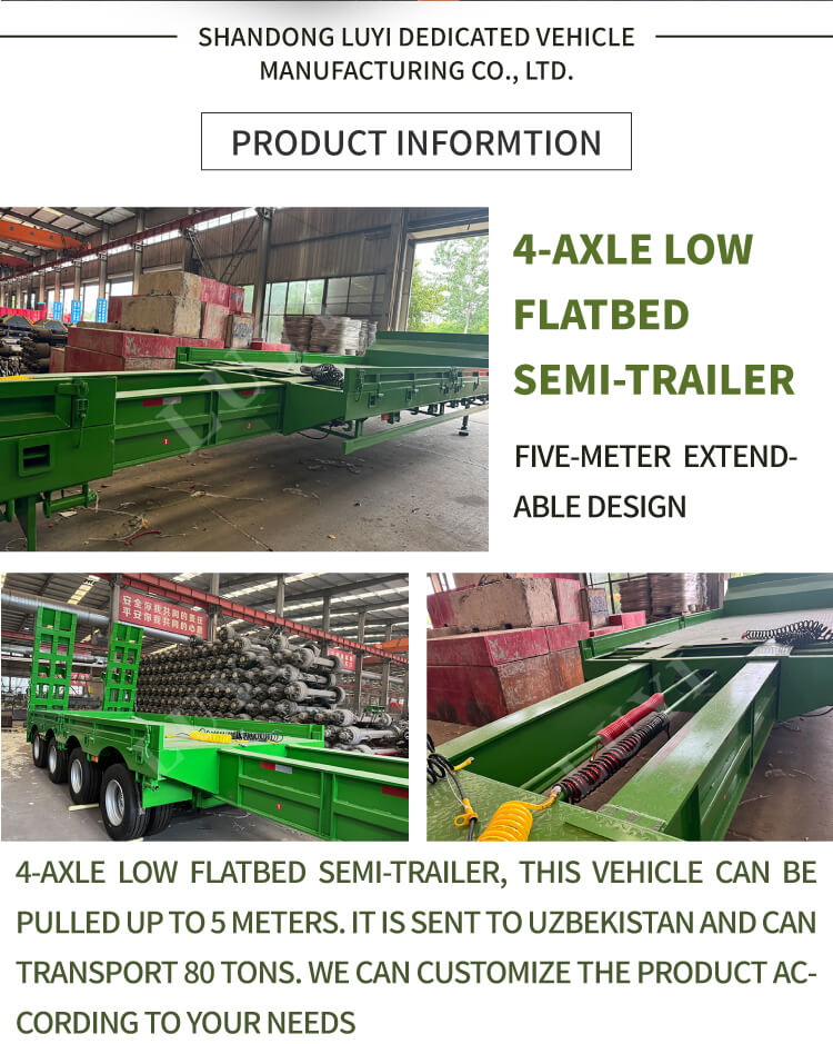 O semirreboque baixo de pescoço de ganso 60T LUYI de 4 eixos, um veículo de transporte pesado de alta qualidade de Shandong, China, é feito sob medida para o transporte de equipamentos pesados. Construído em aço premium, possui dimensões de 22.000 × 3.000 × 1.600 mm e carga útil máxima de 60T, facilitando o transporte de diversas máquinas pesadas.
