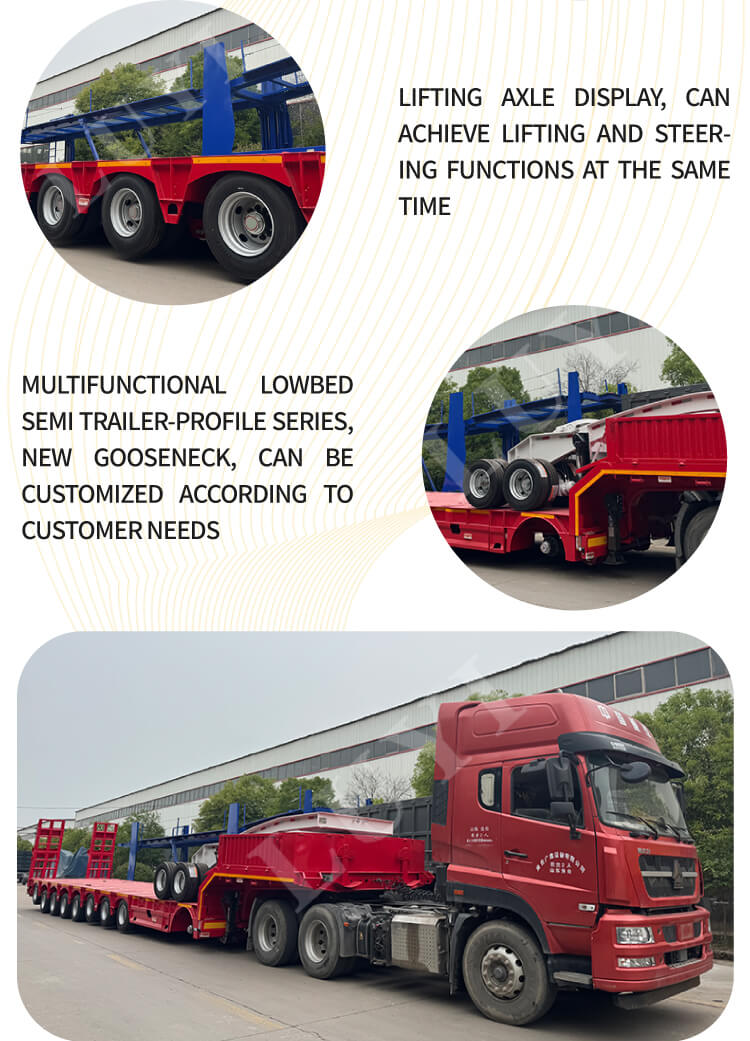 O semirreboque de cama baixa com suspensão pneumática LUYI 8 eixos 120T, originário de Shandong, China, é um semirreboque de alto desempenho especialmente projetado para transporte de equipamentos pesados. Feito de aço de alta qualidade, mede 22.000 × 3.000 × 1.600 mm com carga útil máxima de 100T, atendendo facilmente às necessidades de transporte de diversos equipamentos pesados.
