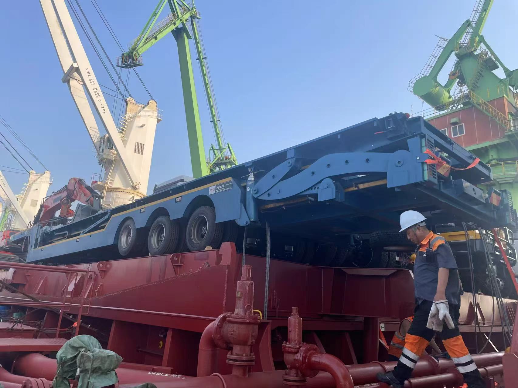 No início do outono, um porto internacional na província de Shandong fervilhava de atividade. Dezenas de LuyiSemirreboques plataforma 3 eixos e 4 pésestavam estacionados de maneira ordenada no terminal. Depois de passar por vários procedimentos, como inspeção alfandegária e reforço de segurança, os semirreboques planos foram lentamente içados para o porão de um cargueiro oceânico por equipamentos de elevação profissionais. Esta operação de carregamento marcou o lançamento oficial da cooperação de transporte transfronteiriço entre a marca Luyi e os clientes cazaques. Os semirreboques planos Luyi de 3 eixos e 4 pés cruzarão as fronteiras nacionais para fornecer soluções de carga pesada para o setor de transporte de engenharia no Cazaquistão.