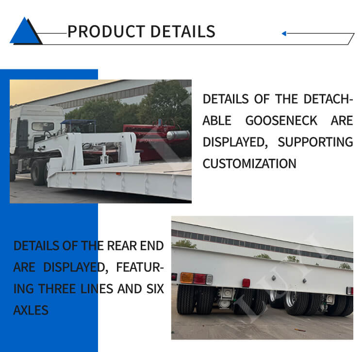 Em termos de detalhes, é equipado com trem de pouso padrão de 28 toneladas e oferece pinos mestre JOST em duas opções: 2" (50mm) ou 3,5" (90mm) para se adaptar a diferentes tratores. A cor da carroceria pode ser personalizada pelos clientes e o design dobrável do pescoço de ganso aumenta ainda mais a flexibilidade de transporte. É a escolha ideal para transferência de equipamentos pesados em engenharia, mineração e outras áreas.